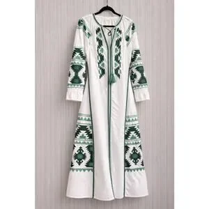 Julia Amory Coatue Caftan Dress Floral Embroidered White Green Cotton Sz XL