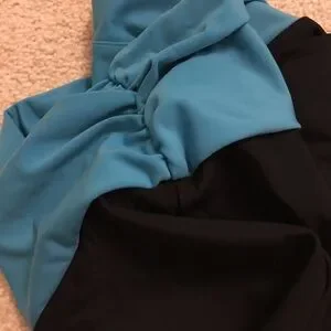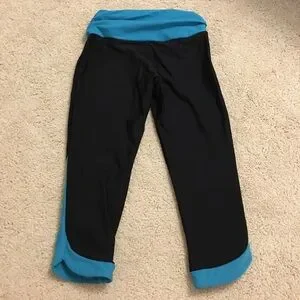 Blue accents on black pants. Super flattering on the stomach because the waist is high rise. Bought some new workout gear so getting rid of things I don't wear anymore. These pants are so soft, stretchy and in great condition!