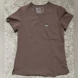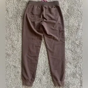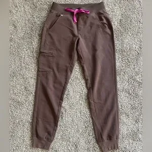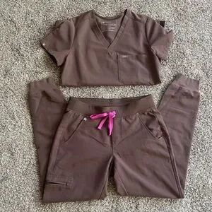 Stylish brown scrub set by Figs. Features pink accents for a pop of color. Catarina top XXS. Joggers XS regular length.