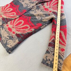 Oversized cardigan sweater showcases a bold intarsia knit pattern in a striking red, grey, and tan color palette. Crafted with a textured, fuzzy mohair-like feel, it features a relaxed longline silhouette with a cozy shawl collar and hidden snap-button closures. The intricate damask-inspired motif adds a bohemian flair, making it an ideal layering piece for cooler weather.