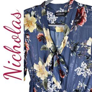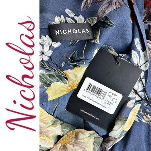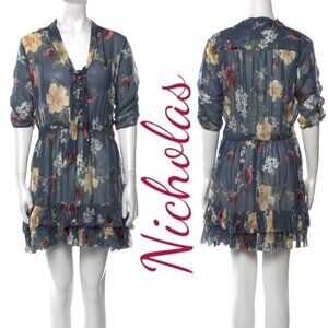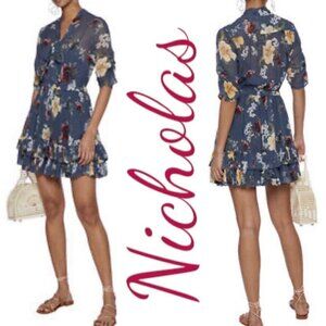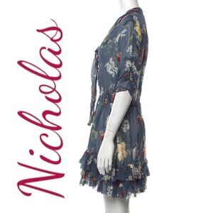 NWT NICHOLAS 100% Silk Slate Blue Floral Ruffled Mini Dress, Size 8