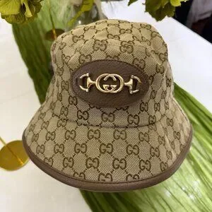 Luxury bucket hat featuring the iconic GG monogram canvas and signature horsebit logo hardware.