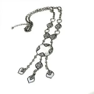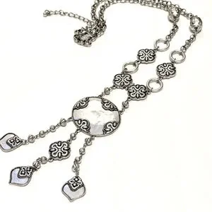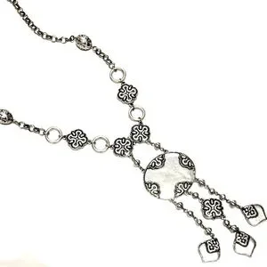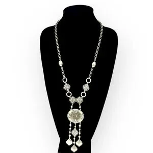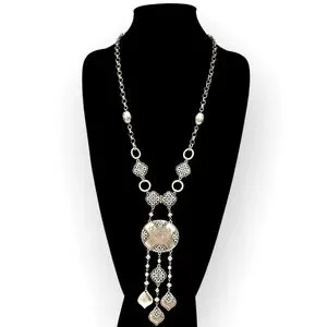 Striking CHICO’S long statement necklace featuring ornate silver-tone links with intricate embossed detailing. The dramatic drop design centers around a large oval medallion with cascading decorative chains and charms that create beautiful movement and vintage-inspired style.