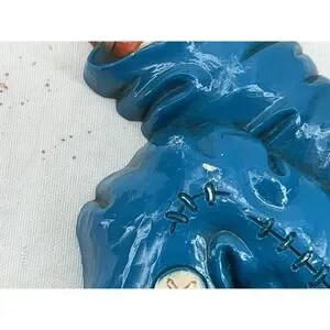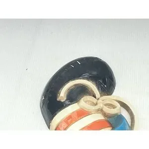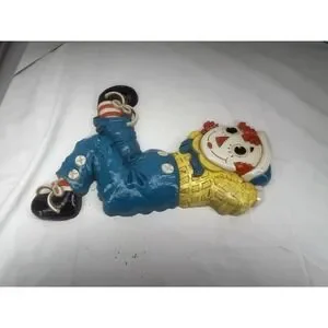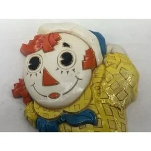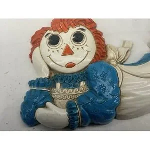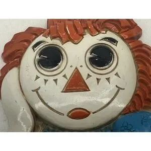 The product is a set of two vintage 1977 Raggedy Ann and Andy wall hanging decor from Bobbs Merrill Co. Each piece measures 13 inches. Made of resin, these wall hangings feature the iconic characters from the popular children's book series, making them a nostalgic and charming addition to any collector's decorative display. Perfect for fans of classic children's literature or vintage decor, these pieces are sure to bring a touch of whimsy and nostalgia to any room.