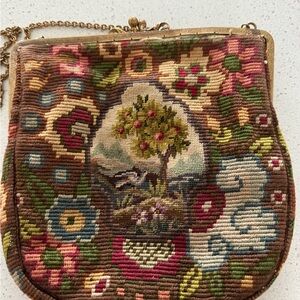 This beautiful vintage needlepoint handbag features a detailed hand-stitched scene of a tree and bird, framed by a vibrant floral border. The brass-toned metal frame has a decorative "kiss-lock" clasp and a delicate chain strap, making it a perfect piece for collectors or those who love authentic Art Deco-era style.