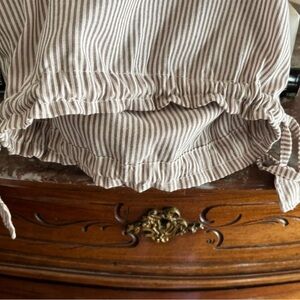 Beige striped interior cotton attached bag, with drawstring closure and one open pocket.