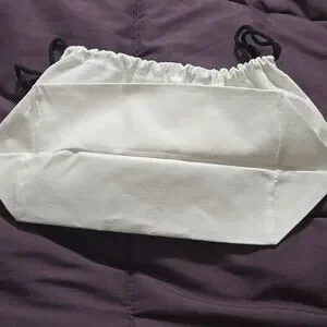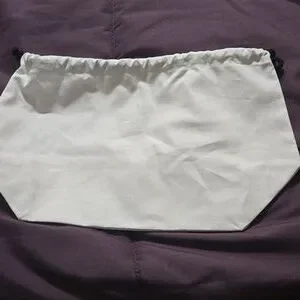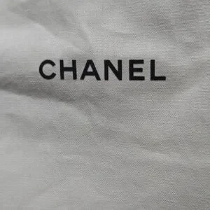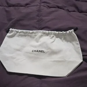 Elegant white dust bag featuring CHANEL logo. Black drawstring closure.