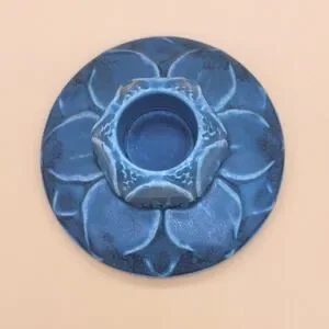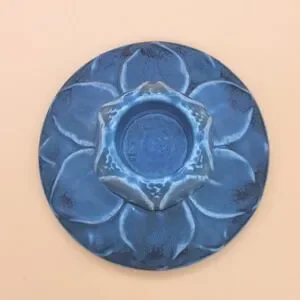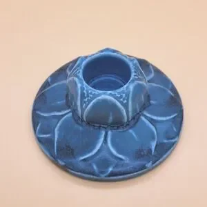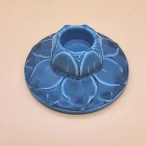 Beautiful pair of authentic Rookwood Pottery candlestick holders, model #2311, featuring the classic lily pad design. Finished in a deep matte blue glaze with subtle tonal variations typical of Rookwood's 1920s art pottery.