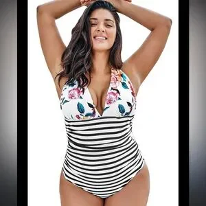 Stylish one-piece swimsuit. Floral top with black and white stripes. Perfect for beach days.