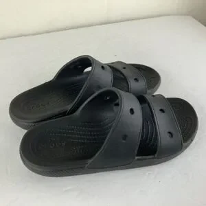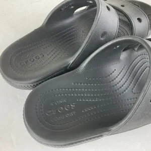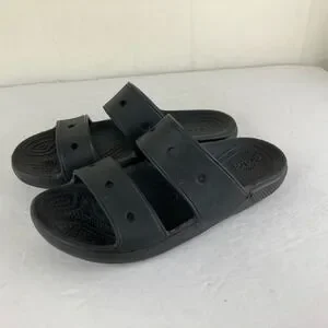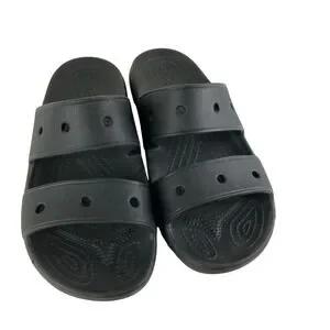 Slide into ultimate comfort with these iconic black Crocs slides. Designed for effortless wear, the Croslite foam construction molds to your feet, providing a personalized cushion with every step. The dual strap design offers a secure yet airy fit, perfect for lounging by the pool or quick errands. Experience the legendary comfort that makes these a go-to for relaxation. Ideal for beach days, casual outings, or simply relaxing at home.