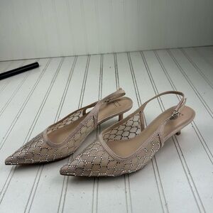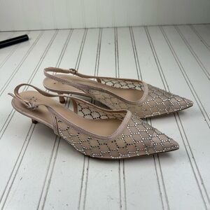 Elegant beige slingback with low kitten heel. Sheer mesh upper adorned with sparkling crystal embellishments. Comfortable slingback strap for a secure fit. Versatile beige color pairs well with dresses and tailored looks.