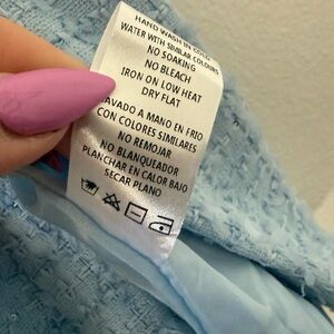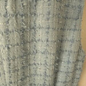 Beautiful Mable light blue textured tweed matching set featuring a sleeveless vest and coordinating shorts. This structured two-piece set has elegant pearl-style statement buttons and a classic Chanel-inspired tweed texture that gives it a polished, feminine look.