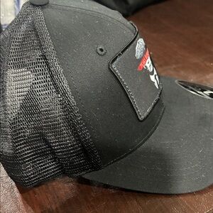 Black trucker hat featuring a Peaky Blinders logo patch. Red logo detail across the front. Mesh back and classic curved bill. Bold, simple design. Custom made! Embroidery with original patch ideas!