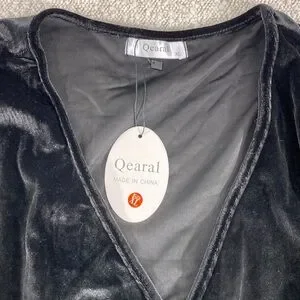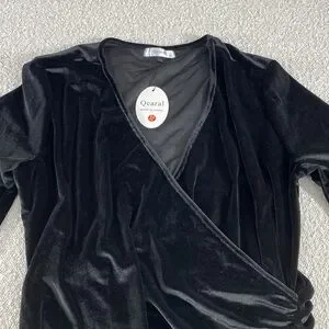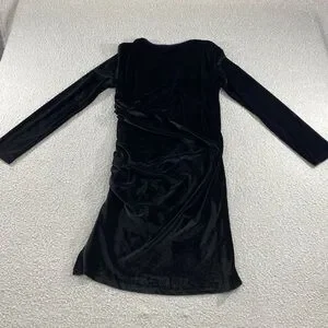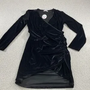 Elegant black velvet wrap dress with side ruching for a flattering silhouette. Features long sleeves and a soft velvet finish. Perfect for evening events and special occasions. Womans xl