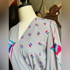 Vintage 1980s wrap-style midi dress by IT’S ME Fashions Ltd. in cool gray with abstract brushstroke print in teal, magenta, and cobalt.