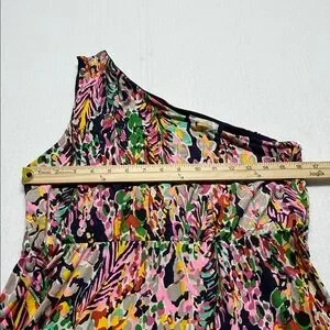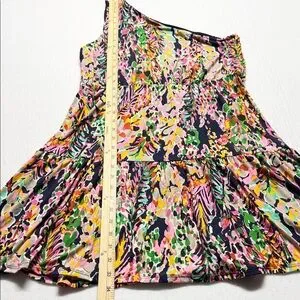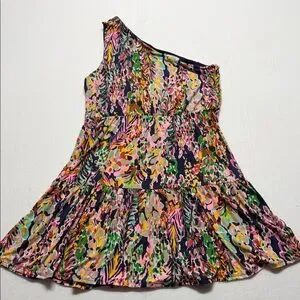 One-shoulder silhouette. Lightweight flowy fabric. Colorful floral and abstract print. Tiered skirt for movement. Easy pull-on styling.