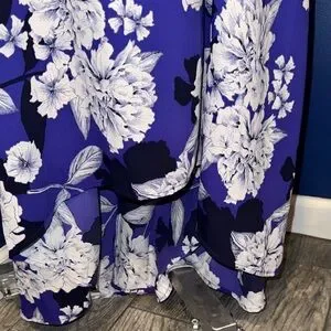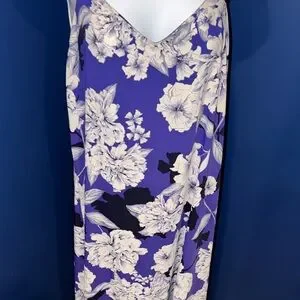 Elegant maxi dress by Tahari. Bold purple base with cream floral print. Lightweight and flowing silhouette. Versatile for day or evening wear.