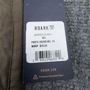Keywords: ROARK, Layover 2.0, shorts, mens, olive green, adventure, utility, zip pockets, drawstring, casual, hiking, outdoor, size 30