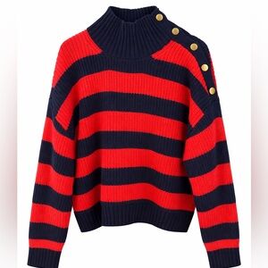 NWT Free Assembly Red Navy Striped Mock Neck Sweater Gold Button Shoulder Knit