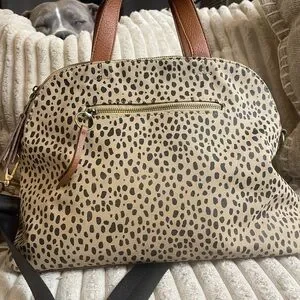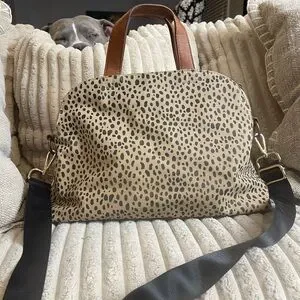 Stylish leopard print tote. Features durable brown handles and a detachable black strap. Perfect for everyday use.