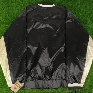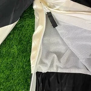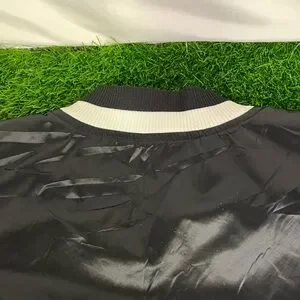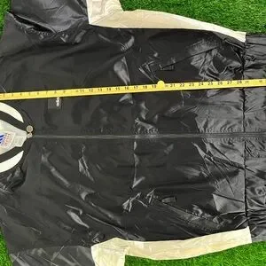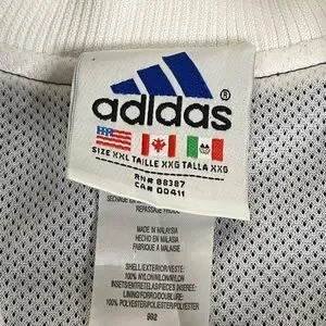 This NWT Vintage 90s Adidas Black & White Satin Bomber Jacket in size 2XL is a stylish and versatile outerwear option for men. Made of lightweight nylon with a satin fabric type, this jacket features a full zip closure and a mid-length cut, making it suitable for various occasions including travel, parties, and casual outings. The black and white color scheme with embroidered logo accents adds a touch of retro flair, while the breathable design with pockets and athletic fit ensures comfort and functionality for activities like track and field, walking, and running. Ideal for all seasons, this bomber jacket is a must-have for any fashion-forward man.