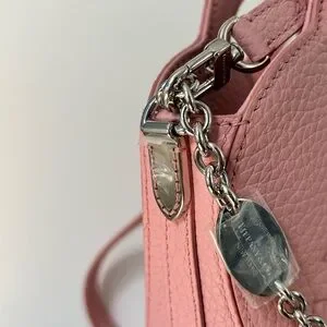 Tiffany & Co. heart-shaped crossbody in rose pink pebble leather. Detachable leather strap with silver-tone chain accent. Embossed Tiffany & Co. logo on front. Feminine and structured silhouette. Versatile for day or evening wear.