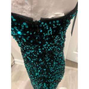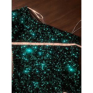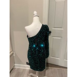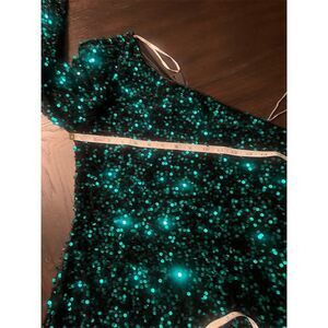Keywords: bodycon dress, evening wear, party dress, cocktail dress, green dress, sequin fabric, one shoulder, long sleeve, fall fashion, form-fitting, short dress, women's fashion, pullover dress, new with tags, hand wash only.