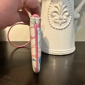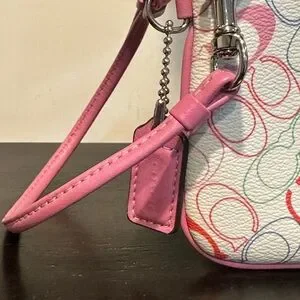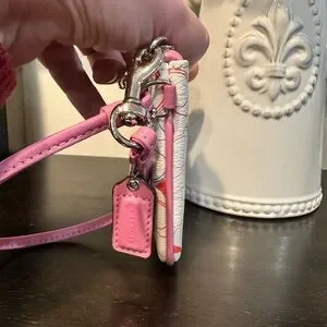 Authentic Coach wristlet wallet pouch featuring the classic Signature C print in a fun multicolor pattern. Finished with pink trim, a zip-top closure, and a removable wrist strap—perfect for carrying cards, cash, keys, or small essentials. Wristlet is in good used condition with some minor marks on interior (see pics)