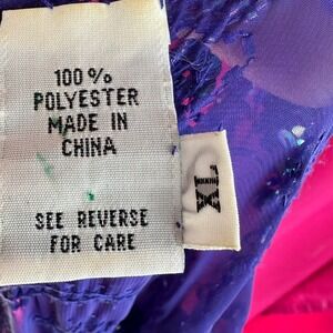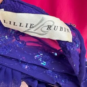 For the icon who loves to sparkle. This late 90s - early 2000s Lillie Rubin masterpiece delivers full glam with sheer purple mesh, iridescent floral sequins, and hand beaded purple details at the neckline and hem. A rare showstopper for parties, special events, and dopamine dressing moments. Pullover with keyhole back and hook closure. 100 percent polyester.