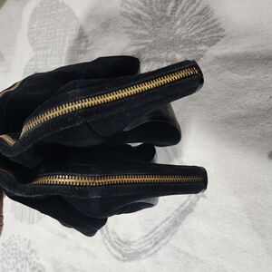 ✨ Elevate your style with these stunning Vince Camuto Carleen knee-high boots! Crafted from luxurious black suede, these boots feature a sleek silhouette, chunky high heels, and gold-tone back zippers for an elegant touch. Perfect for dressing up or adding sophistication to any outfit!