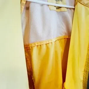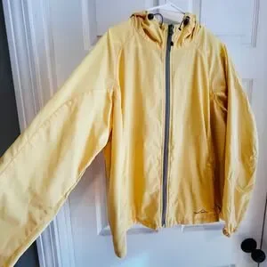 Keywords: Eddie Bauer, sport jacket, hooded, lightweight, zip up, athletic, outdoor, travel, windbreaker, activewear, casual, yellow jacket, performance