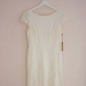 Elegant lace midi dress by Vince Camuto. Cap sleeves and a boat neckline. Fitted waist with delicate floral lace overlay. Sleek, classic silhouette for special occasions. I only wore the dress once, so it’s in great condition. It was a little small on me. I bought it NWT, but I am reposhing it because I can’t fit it. It’s no longer NWT, but was worn once.