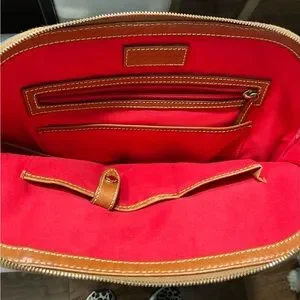 Classic Dooney & Bourke satchel in pebbled teal leather. Brown leather trim and handles. Gold-tone hardware and logo plaque. Structured top-handle silhouette. Timeless, versatile style.
