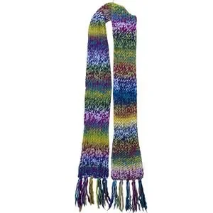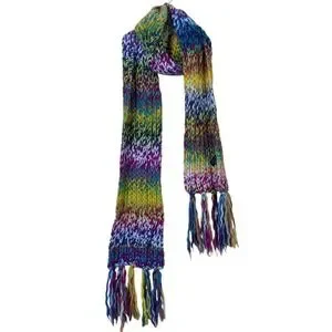 Keywords: knit scarf, multicolor, fringed, acrylic, one size, cozy, warm, winter accessory, fall fashion, bright colors, textured, statement scarf