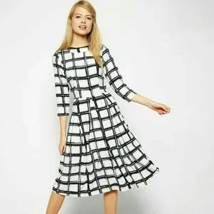 ASOS midi dress in a windowpane check. Three-quarter sleeves and a fitted waist. Flared skirt for movement. Classic crew neckline. Bold monochrome pattern. It’s a really cute dress and was gently worn. It’s in great condition.