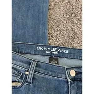 Keywords: DKNY Jeans, Soho Skinny, Denim Jeans, Womens Jeans, Patchwork Jeans, Repurposed Denim, Floral Patches, Designer Jeans, Unique Jeans, Bohemian Style, Casual Jeans, Embroidered Jeans, Distressed Denim