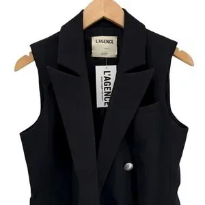 A chic black sleeveless double-breasted blazer dress from L'Agence. This sophisticated piece features a classic notched lapel, striking silver-tone button closures down the front, and functional flap pockets. The tailored silhouette is designed to flatter, making it a versatile addition to your wardrobe. Perfect for a power meeting or an elegant evening out.