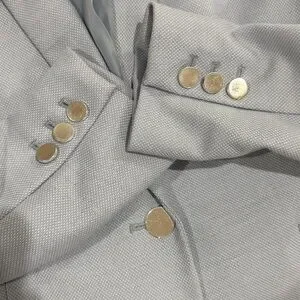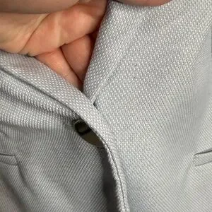 The prettiest blue ever! Short, fitted, lined blazer with silver button detail. Great condition minus small snag as shown in last photo.