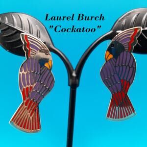 *Description: This is a beautiful pair of vintage Laurel Burch Cockatoo bird earrings from the 1980s. Each earring is stamped Laurel Burch and Cockatoo and is gold plated with very reflective outlines on the front and enamel in red, blue, and purple. This would be the perfect gift for the bird lover in your life.