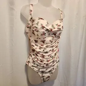 Chic floral one-piece swimsuit with pink and green accents. Perfect for a stylish beach day. Has adjustable straps, and sweetheart neckline, padded chest, is NWT.