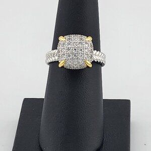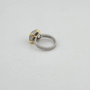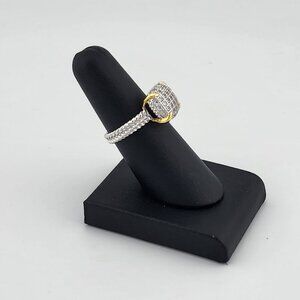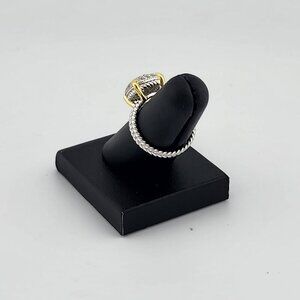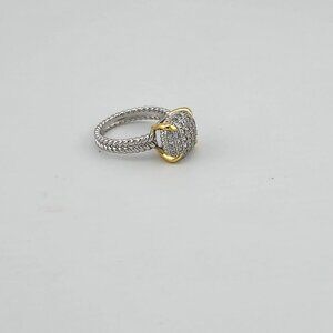 This Sterling Silver 925 Ring features a stunning Cubic Zirconia Stones held securely by gold-dipped prongs, creating a beautiful contrast that enhances its delicate sparkle. The elegant braided band adds a unique, textured charm to the design. Brand new with tags and packaged in a free jewelry bag, it's a fresh and graceful piece perfect for any occasion.