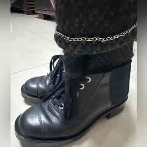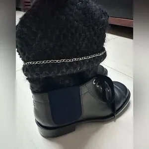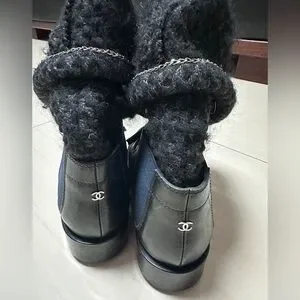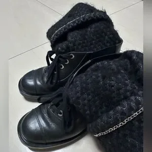 Auth Chanel Black Navy Blue Tweed Boots Socks Boots 39 Women