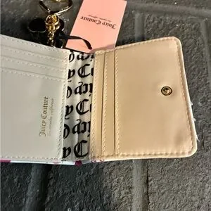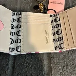 Small Juicy Couture bi-fold wallet. White exterior with bright pink cherry print and logo. Gold-tone heart key charm attached. Sweet, playful design for everyday use.