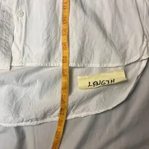 Lightweight rayon button-down shirt offers a relaxed silhouette with a dramatic high-low hemline. This versatile piece features a classic pointed collar, a single chest patch pocket, and long sleeves with button cuffs. The back is designed with a horizontal yoke and a center box pleat for added movement and a comfortable drape. Perfect for layering or wearing solo, its crisp white shade and fluid fabric make it an essential for effortless everyday styling.
