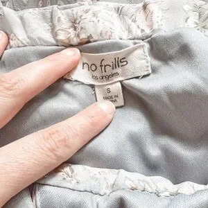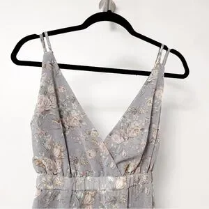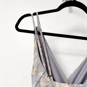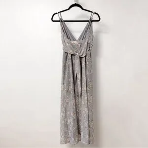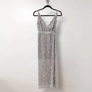 No frills midi dress. V neck. Tie back. Double adjustable spaghetti straps. Elastic at chest. Lined to mini length. Sheer with high slits skirts. Very light purple/gray in color with cream and light pink flowers all over. Size Small
