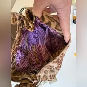 This bag has the classic early-2000s Kathy aesthetic - leopard print fabric, chunky silver hardware, and decorative zipper accents. Perfect statement piece for Y2K outfits or everyday use.
