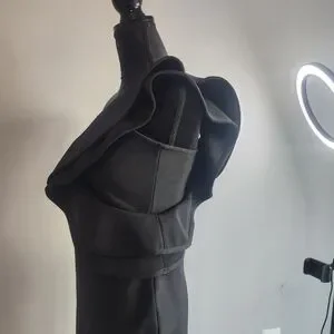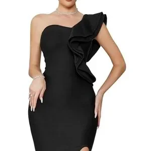Stunning one-shoulder black dress with an elegant ruffle accent. Sleek bodycon silhouette flatters the figure. Subtle front slit for a touch of allure. Ideal for evening events and cocktail parties.