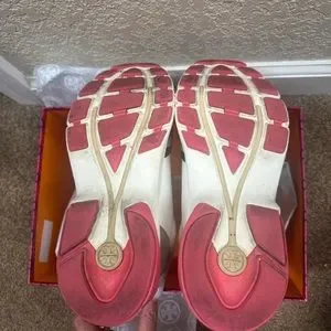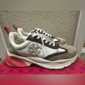Tory Burch women's sneakers. White leather panels with gray suede overlays. Pink accent on heel pull tab and inner lining. Cushioned platform sole for comfort. Classic Tory Burch logo on side.does have some bleeding through from the black. Maybe can be removed. See pics for condition