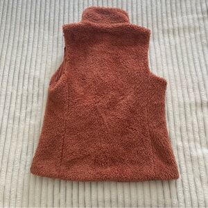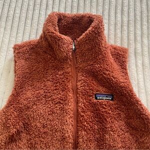 Patagonia women’s pinkish colored furry vest. I believe that this style is called the Los Gatos Vest. Full zip front, mock neck, pockets by the hips. Excellent condition.