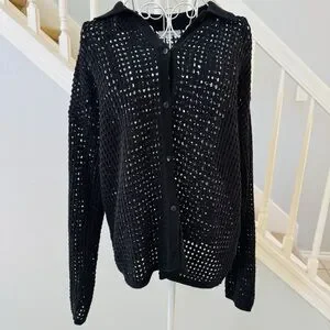 A lightweight black open-knit sweater cardigan with a classic collar. Designed for breathable layering and easy styling. Features button-front closure and three-quarter sleeves. Versatile black color pairs well with casual or elevated looks.